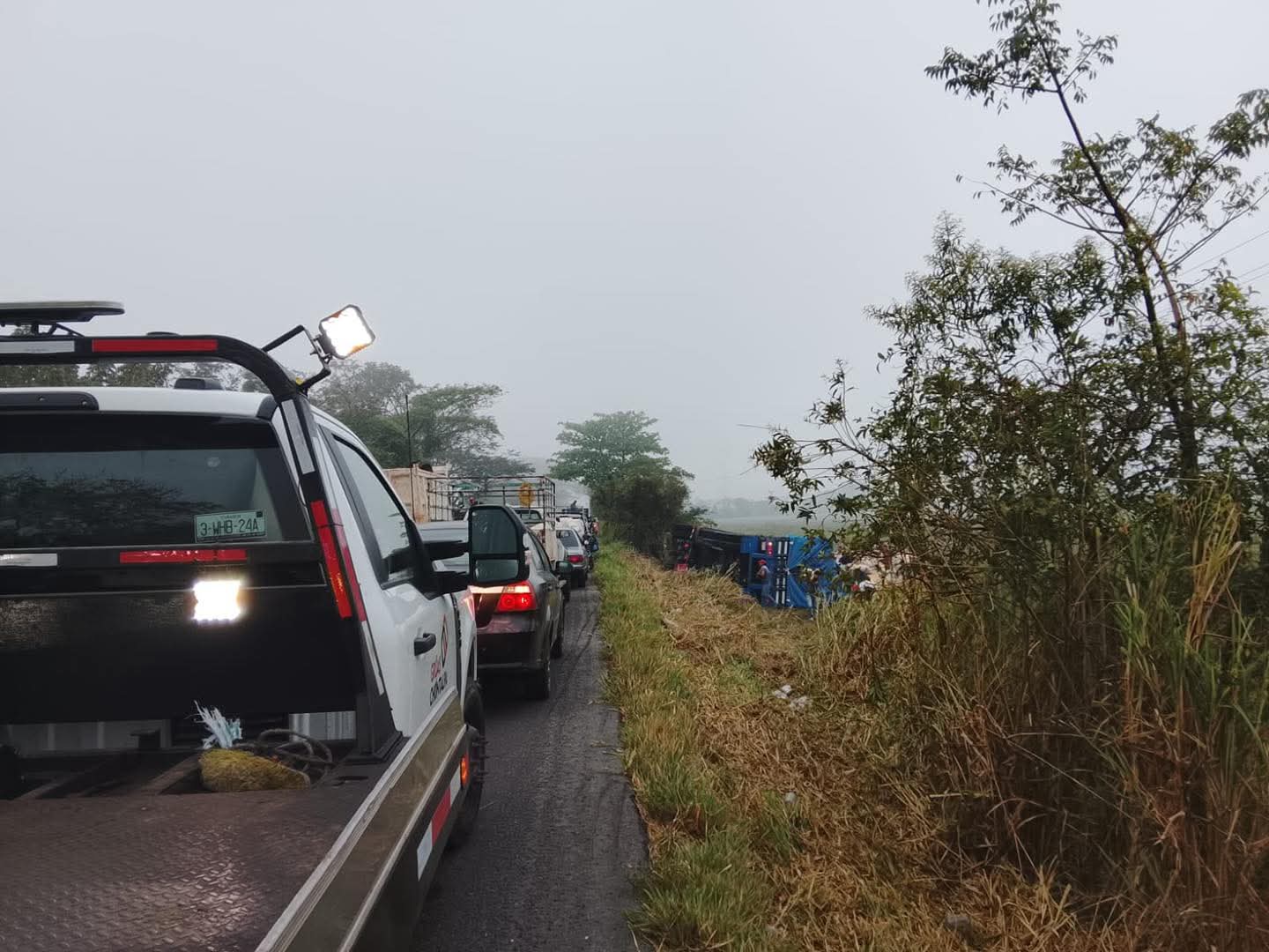 Un tráiler de doble semirremolque que transportaba toneladas de maíz terminó fuera de la cinta asfáltica la mañana de este miércoles 11 de marzo de 2026 sobre la carretera Huimanguillo – Chontalpa, generando un incidente que rápidamente atrajo a habitantes de la zona.