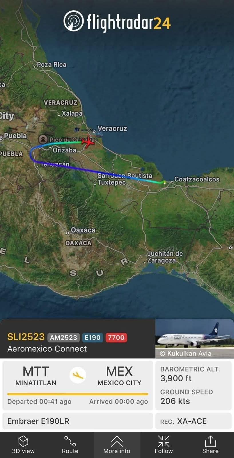 De acuerdo con información difundida por la página especializada Aviación Mundial, se trató del vuelo AM2523 operado por Aeroméxico Connect, el cual era realizado con un avión tipo Embraer E190.