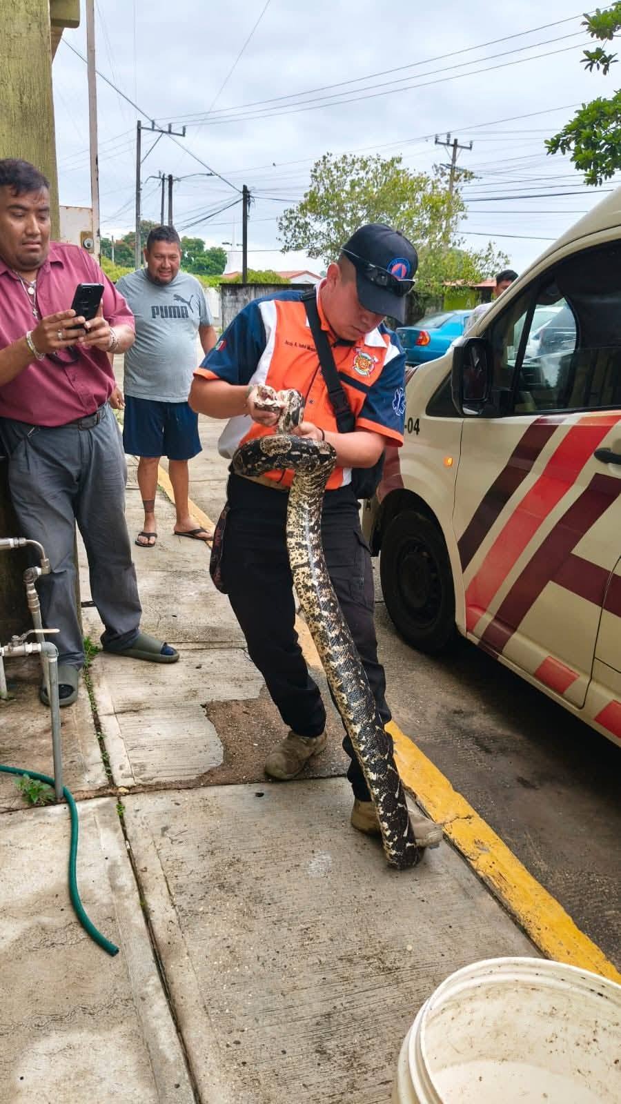 El inusual hallazgo provocó alarma y curiosidad entre los residentes, quienes rápidamente dieron aviso a los cuerpos de emergencia. Minutos después, arribó un equipo especializado de Protección Civil y Bomberos, encabezado por Jacob Antel y Nathalia Mendoza, quienes lograron capturar al reptil sin causarle daño ni poner en riesgo a los vecinos.