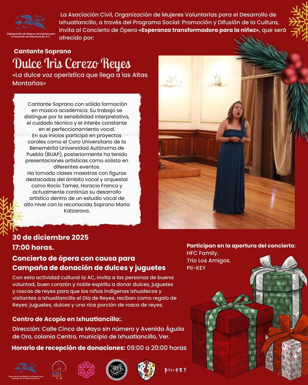 Ixhuatlancillo, Ver.– Con el objetivo de promover la cultura y fortalecer la solidaridad social, la Asociación Civil Organización de Mujeres Voluntarias para el Desarrollo de Ixhuatlancillo, a través de su Programa Social de Promoción y Difusión de la Cultura, realizará el Concierto de Ópera “Esperanza transformadora para la niñez”, el próximo 30 de diciembre de 2025, a las 17:00 horas.