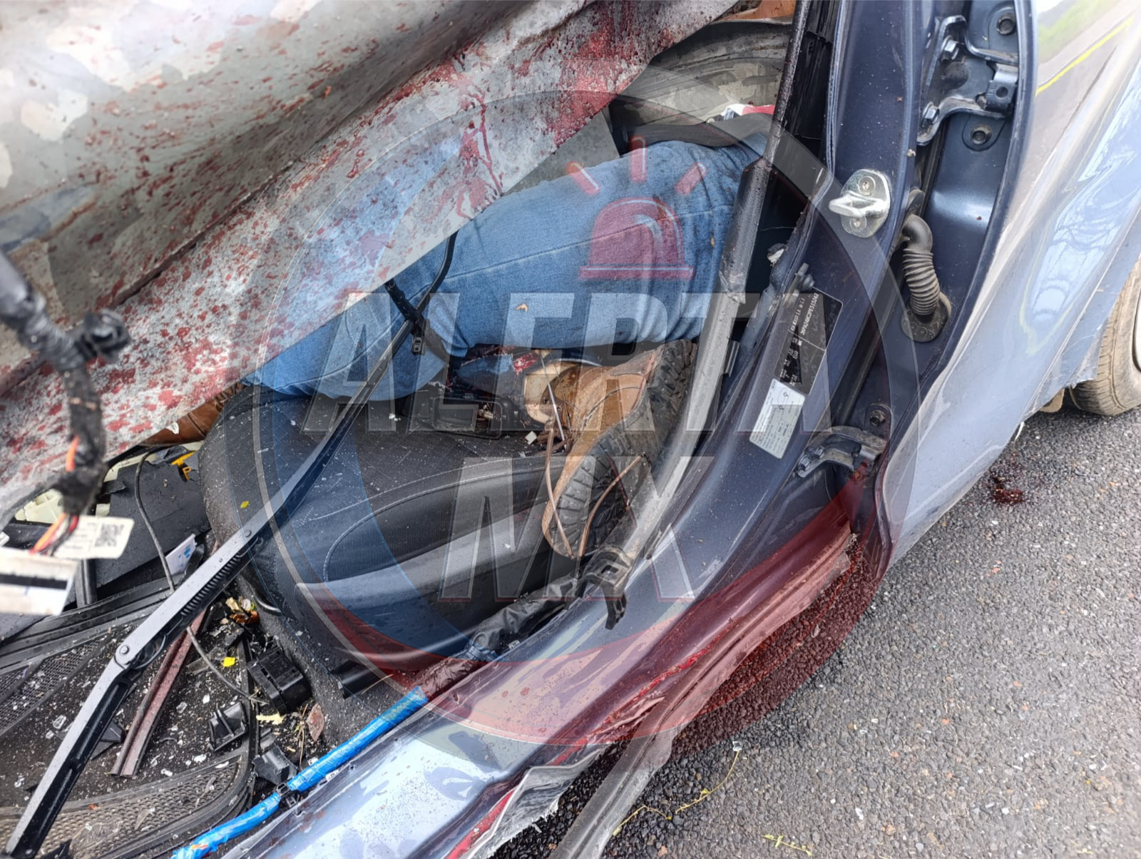 El vehículo marca KIA RIO color azul con placas GZP582J del Estado de Guerrero quedo impactado en el muro metálico y el conductor prensado.