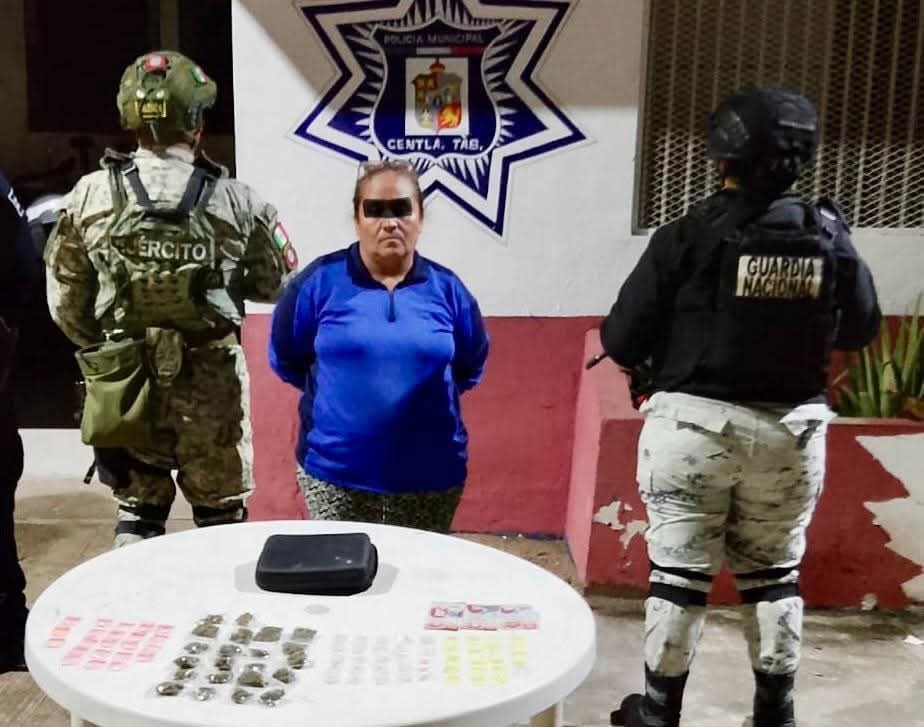 Elementos de la Guardia Nacional y del Ejército Mexicano lograron la detención de María del Carmen “N”, de 45 años de edad, originaria de Frontera, Centla, Tabasco, en posesión de diversas dosis de drogas.