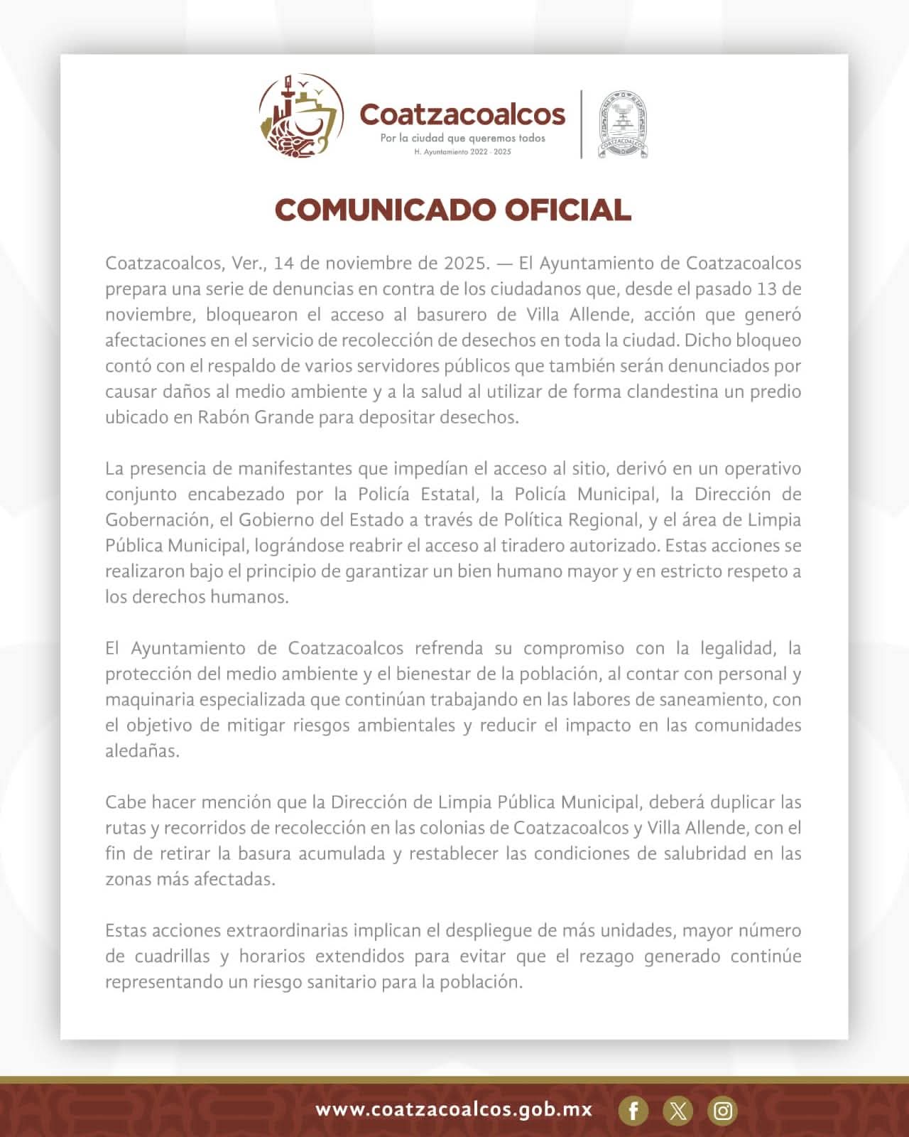 El Ayuntamiento de Coatzacoalcos anunci贸 que presentar谩 denuncias formales contra los ciudadanos que el pasado 13 de noviembre bloquearon el acceso al basurero de Villa Allende, acci贸n que provoc贸 afectaciones graves en el servicio de recolecci贸n de desechos en toda la ciudad.