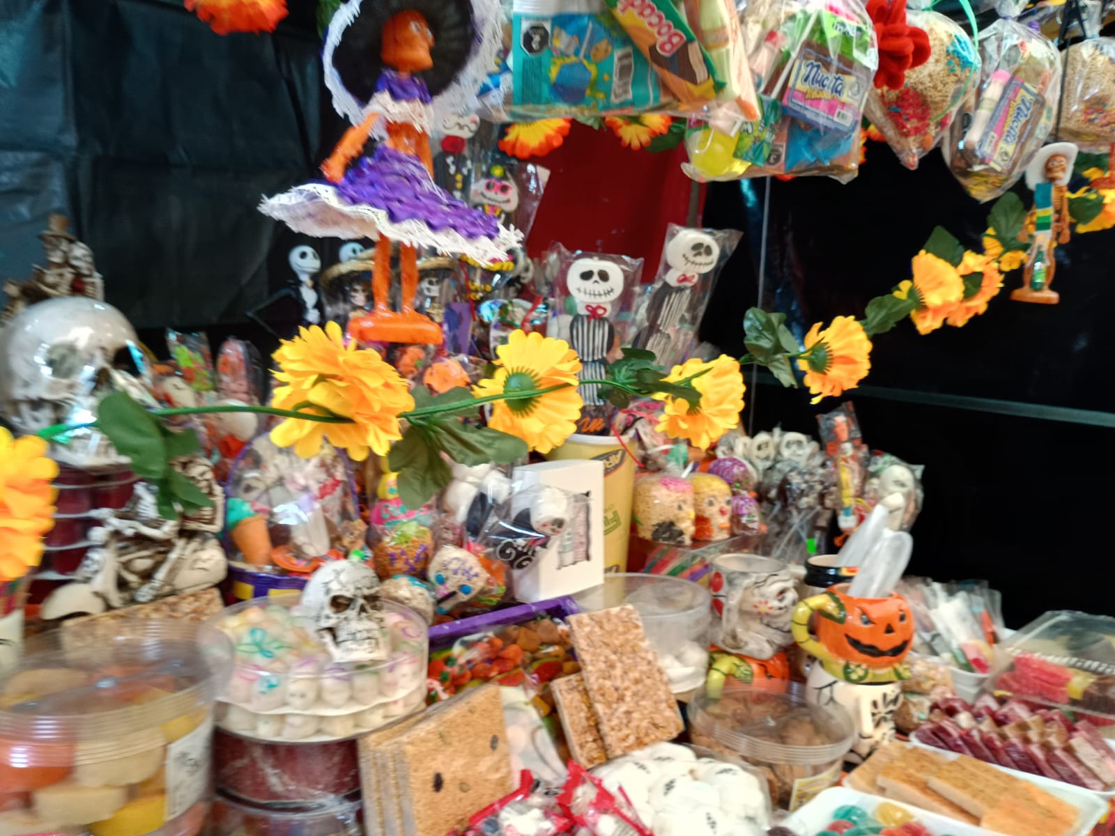Entre los pasillos se pueden encontrar figuras de barro, veladoras artesanales, papel picado, coronas, incienso, calaveras decoradas, ropa con motivos tradicionales, así como una variada oferta gastronómica que incluye dulces típicos, pan de muerto y mole, indispensables en los altares familiares.