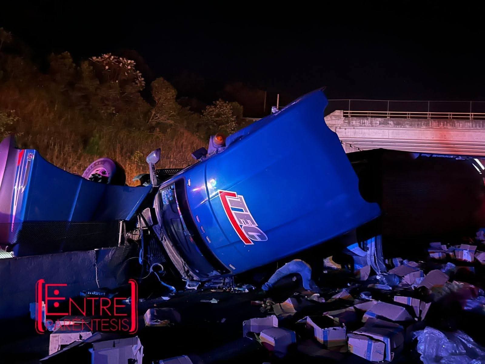 El percance ocurrió en el kilómetro 147, cuando la unidad descendía por una pendiente y el conductor perdió el control, impactando inicialmente contra una camioneta Nissan NP300. Posteriormente, el tráiler colisionó contra el muro divisorio, lo que provocó que uno de los contenedores con suero se desprendiera y quedara atravesado en el carril contrario.