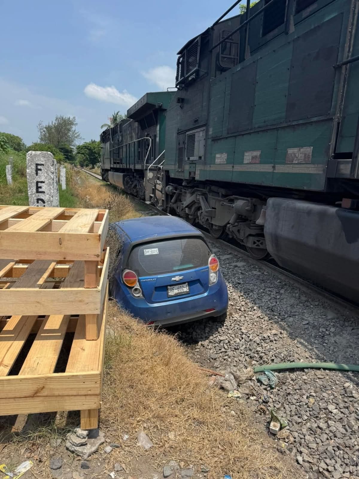 El percance se registró sobre la avenida Azteca, cuando un vehículo Chevrolet Spark, color azul y con placas del estado de Chiapas, quedó detenido sobre las vías tras sufrir una falla mecánica. La conductora, identificada como Yuliana, intentó arrancar el auto sin éxito, justo cuando la locomotora se aproximaba a gran velocidad.