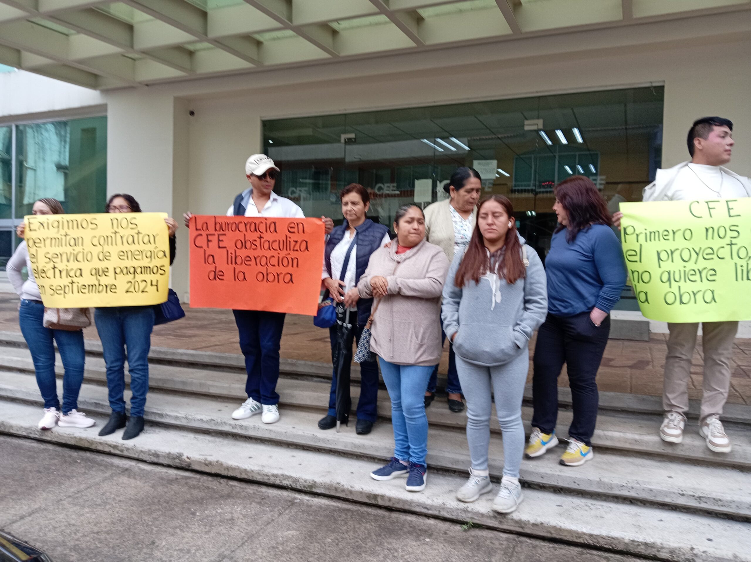 Es el momento en que no nos permiten realizar los contratos del servicio de energía, la obra ya está terminada desde el año pasado, pero por la burocracia aquí en comisión Federal de electricidad me han puesto trabas, documentos que me han pedido constantemente, fácil he dado casi 30 vueltas he venido aquí a las oficinas de comisión federal, para que me den la liberación de la obra, sin embargo siempre me piden otro document que hace falta y son largas y largas y así nos han traído vueltas y vueltas y por eso es de que la paciencia ya se agotó y por eso es que nos estamos manifestando aquí en las oficinas de la sugerencia de producción hidroeléctrica del Golfo de comisión federal de electricidad.