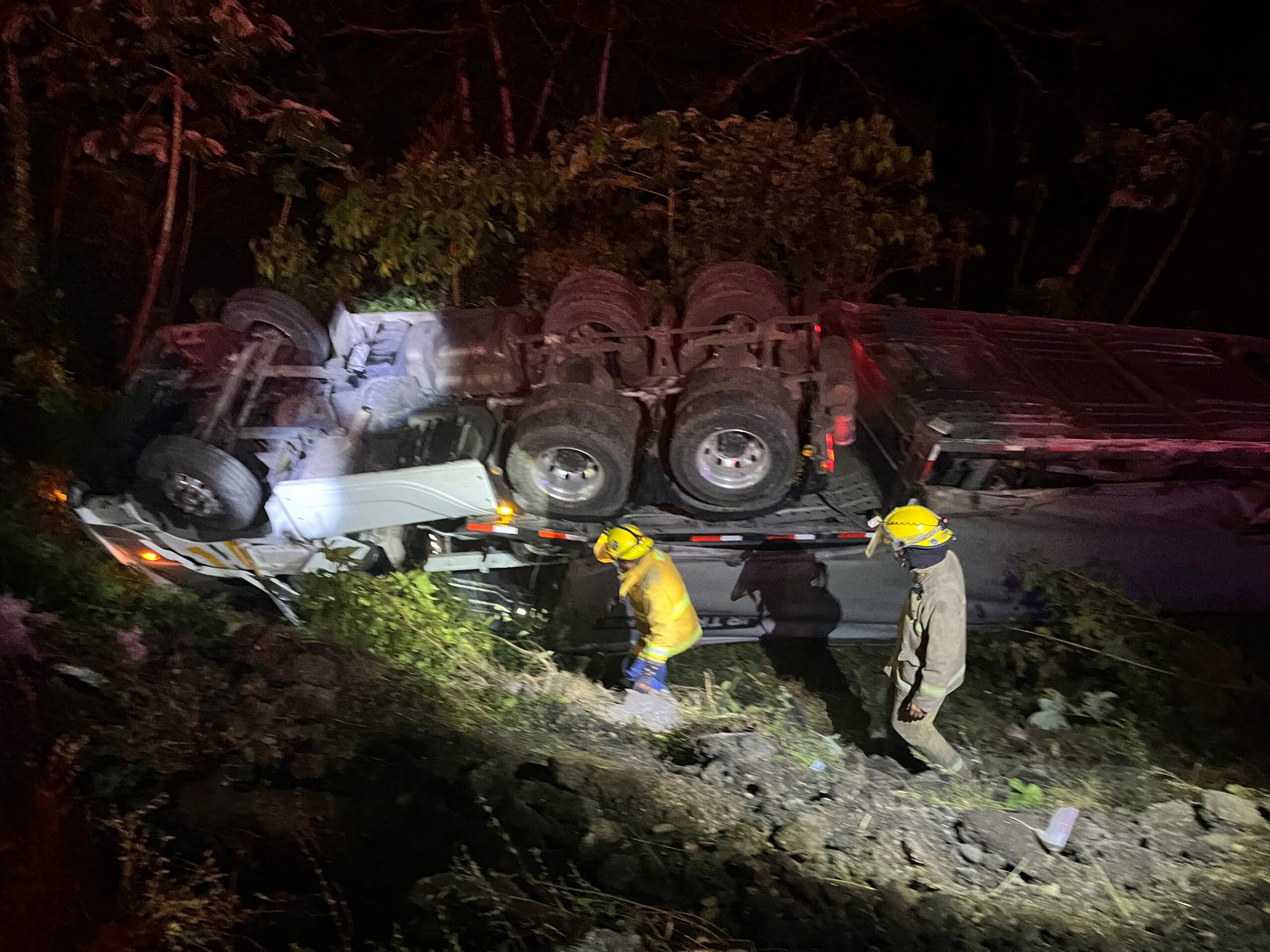 De acuerdo al testimonio del conductor de la madrina, otro tractocamión trató de rebasarlo y golpeo la unidad de un costado, provocando que perdiera el control del tráiler, saliéndose de la carpeta asfáltica y terminando en un barranco con las llantas hacía arriba.